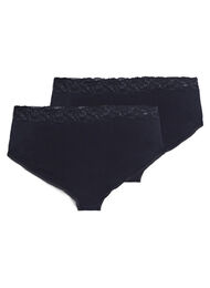 Set med 2 hipstertrosor i mjuk bomullskvalitet. Trosan har en normal midja och feminina spetsdetaljer.