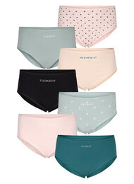 Trosor med normal midja och breda fållar för en superbekväm passform. Varje trosa i setet är tillverkad i skön bomullskvalitet och har olika färger och mönster samt en markering för varje veckodag.