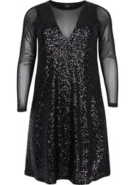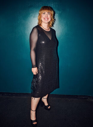 Festklänning med långa genomskinliga ärmar i mesh och en löst sittande A-form. Klänningen är dekorerad med paljetter och har ett mjukt viskosfoder.