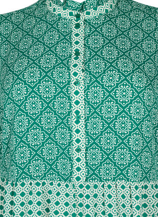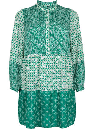Långärmad klänning med kort knappstängning och volangkrage. Klänningen är tillverkad av 65 % återvunnen polyester och designad i en fin blandning av mönster och skärningar för att skapa en vacker, lös drapering i A-linjeform.