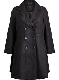 Elegant kappa i tidlös design med en feminin silhuett där passformen är mer figurnära upptill ner till midjan, varefter den får mer volym. Kappan har en klassisk kavajkrage, dekorativa dubbelknäppta knappar och sidofickor. Den är tillverkad i en mjuk och varm materialmix av 50 % återvunnen polyester och 20 % ull.