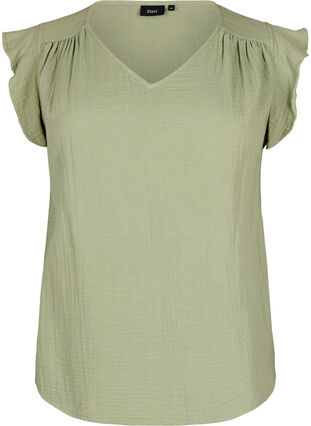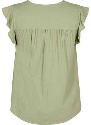 Feminin topp i 100 % mjuk och andningsbar bomullsmuslin med V-ringning och bekväm passform. Toppen är ärmlös och designad med små veck upptill och en fin volangkant vid axlarna, vilket ger en lätt och elegant look. Baktill har toppen en rynkad detalj under oket, vilket ger ett mjukt fall och en avslappnad look.