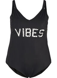 Snygg baddräkt med ett trendigt tryck över bröstet. Baddräkten har en v-ringning samt justerbara axelband.