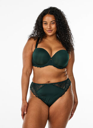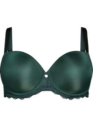 Bygel-BH med formpressade, lätt vadderade kupor som formar bysten och skapar en slät, rund siluett. Kuporna lyfter och stödjer, döljer bröstvårtorna och jämnar ut eventuella storleksskillnader. BH:n har breda, justerbara axelband, höga sidopaneler och en u-formad rygg som håller banden på plats, ger optimalt stöd och säkerställer bekväm viktfördelning. Den släta ytan gör BH:n osynlig under kläder, och designen avslutas med fina spetsdetaljer under byglarna och på ryggen.