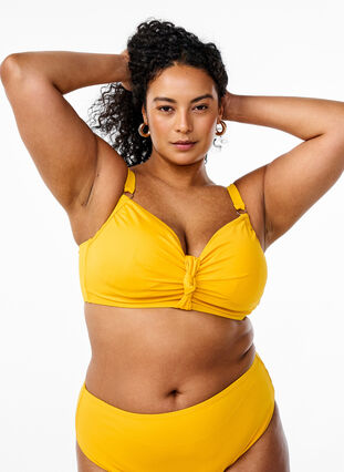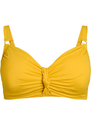 Snygg bikinitopp med elegant drapering och en dekorativ knutdetalj mellan kuporna som skapar en feminin och stilren look. Bikinitoppen har bygel för extra stöd, urtagbara kuddar för justerbar volym och justerbara axelband för optimal passform. Tillverkad i ett klorresistent, hållbart och snabbtorkande material, vilket gör att bikinin håller länge både i färg och form.