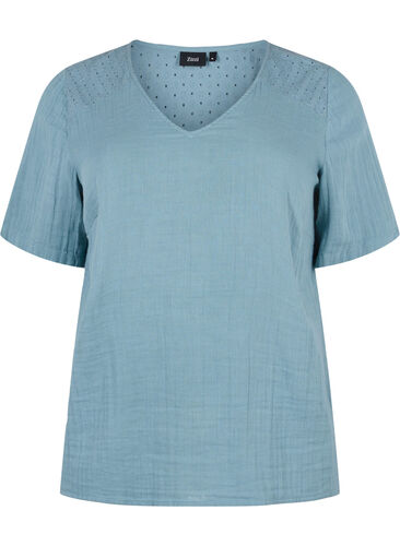Mjuk bomullsblus med struktur och feminina detaljer med broderi anglaise i överdelen.. Den har korta ärmar, är v-ringad och är skuren på baksidan med små veck, vilket ger ett fint fall på blusen.