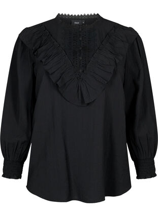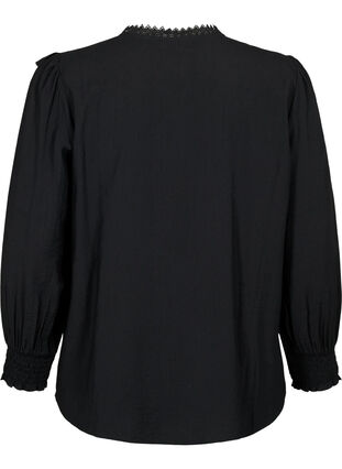 Feminin långärmad blus med smockade och volangförsedda ärmar och en vacker broderi- och volangdetalj på framsidan. Denna blus innehåller 80 % LENZING™ ECOVERO™ Viscose fibrer, som ger naturlig mjukhet och drapering.