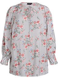 Blus i mjuk viskoskvalitet med feminint blommönster kombinerat med smala ränder. Blusen har rund halsringning med slits och knytning framtill, och normal passform. De långa ärmarna avslutas med smockade muddar, vilket skapar en lätt och elegant puffeffekt.