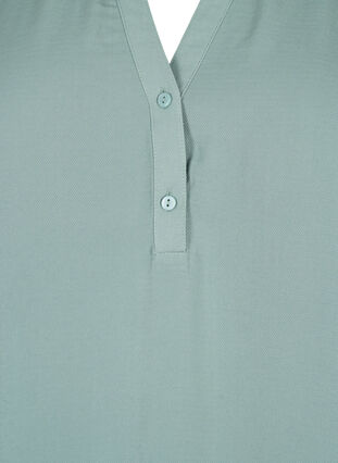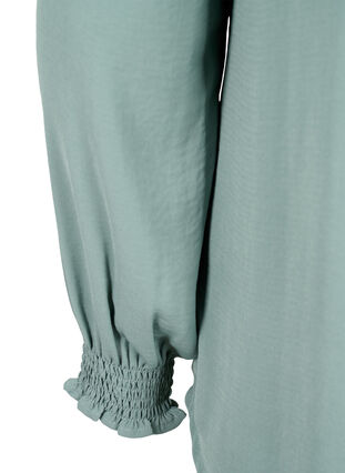Härlig blus med v-ringning, knappar och en feminin volangkrage. Blusen har långa ärmar med en lätt puff och smockavslutning och små draperingar på baksidan som ger en lätt drapering baktill.