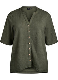Skjortblus med normal passform, 3/4-ärm, v-ringning och knappstängning fram. Skjortblusen är tillverkad i ett mjukt material med en lätt strukturerad yta.