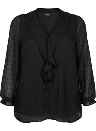 Blus med prickigt tyg och mjukt foder. Blusen har dekorativa volangdetaljer i halsringningen och ärmfållen, vilket ger den en elegant touch och feminin look.