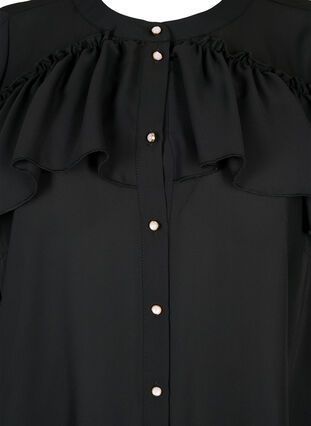 Rundhalsad skjortblus med knappstängning och vackra pärlknappar. Skjortblusen är dekorerad med en bred volang fram och baktill.