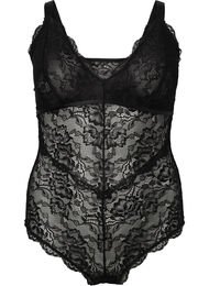 Feminin kroppsstrumpa i vacker och stretchig spetskvalitet. Kroppsstrumpan är v-ringad och har justerbara axelband.
