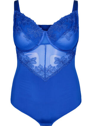 Den här eleganta bodyn är tillverkad i en kombination av mjuk mikrofiber och transparent mesh med broderade detaljer som ger en feminin touch. Bodyn har bygel, justerbara axelband och kuporna har dubbla lager för extra komfort och stöd. Baktill har bodyn trosa-form för minimal täckning och knäpps med hyskor baktill och tryckknappar i grenen.