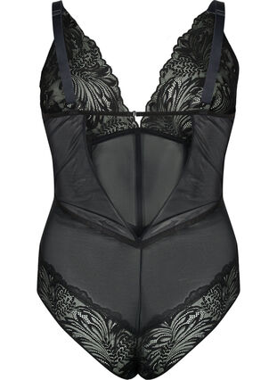 Vacker body med mesh och feminin spets. Bodyn har en djup v-ringning, justerbara axelband och dolda tryckknappar i grenen.