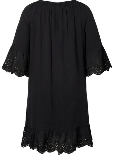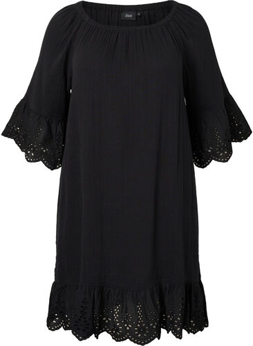 Löst sittande sommarklänning i 100% bomull, som har vacker broderi anglaise på ärmar och nederkant. Klänningen har 3/4-ärmar och en rund halsringning med resårkant, som även kan bäras som off-shoulder.
