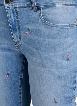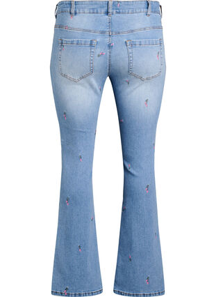 Jeans med broderade blommor, normal midja, bälteshällor och fickor fram och bak. Jeansen har smal passform med utsvängda ben, dragkedja och knappstängning och är tillverkade i ett mjukt och stretchigt blandmaterial med bomull.