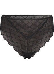 Brasilianska trosor i vacker spets med skulpterad kant. Dessa trosor har en normal midja, en bomullsfodrad kil och täcker den övre delen av skinkan.