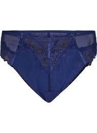 Brazilian-trosor i lätt, genomskinlig mesh med vackra spetsdetaljer och satinband, som skapar en super feminin look. Dessa trosor har normal midjehöjd med delvis täckning bak, där endast den övre delen är täckt, och en bomullsfodrad gren.