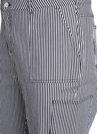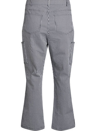 Randiga cargojeans i en stretchig bomullskvalitet. Jeansen har hög midja med bälteshällor, en invändig justerbar elastisk midja och stängs med dragkedja och knapp. Jeansen har en rak passform som ger en rak siluett från lår till ankel.