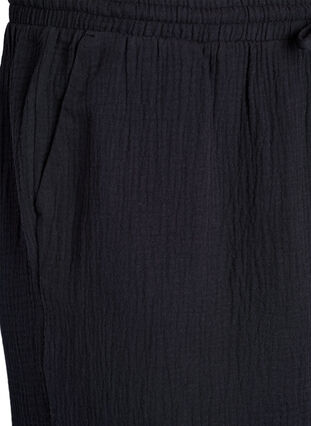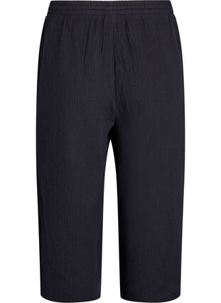 Culottebyxor i 100 % bomullsmuslin – ett mjukt och andningsbart texturerat tyg. Byxorna har hög midja med resår och dragsko, sidofickor samt en lös, bekväm passform i 7/8-längd.