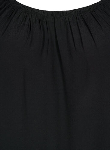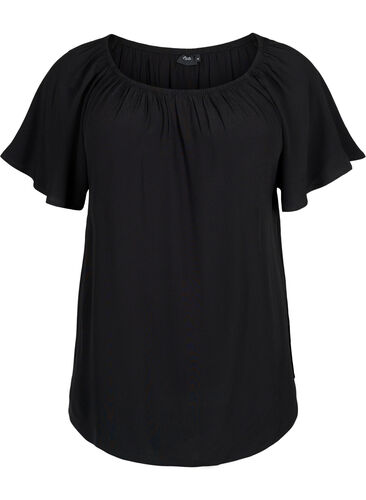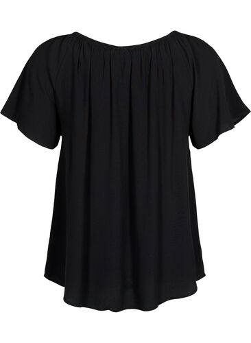 Löst sittande blus med korta ärmar med vidd och rund halsringning med elastisk kant så att den även kan bäras off-shoulder. Denna blus innehåller 51 % LENZING™ ECOVERO™ Viscose fibrer, som ger naturlig mjukhet och fall.
