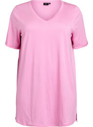 Oversize t-shirt, som är tillverkad i en mjuk blandning av bomull och viskos. T-shirten har en liten slits i sidan, är v-ringad och har korta ärmar med uppslag.
