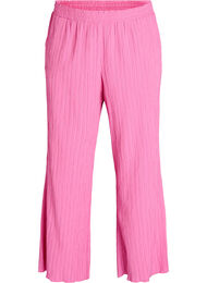 Byxor i en mjuk viskosblandning med stretch, tillverkade i ett lätt och strukturerat tyg med diskret randigt mönster. Byxorna har hög midja med resår, sidofickor och lös passform med vida ben.