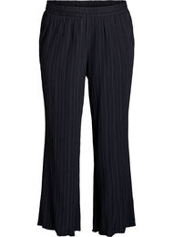 Byxor i en mjuk viskosblandning med stretch, tillverkade i ett lätt och strukturerat tyg med diskret randigt mönster. Byxorna har hög midja med resår, sidofickor och lös passform med vida ben.