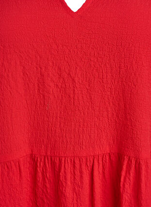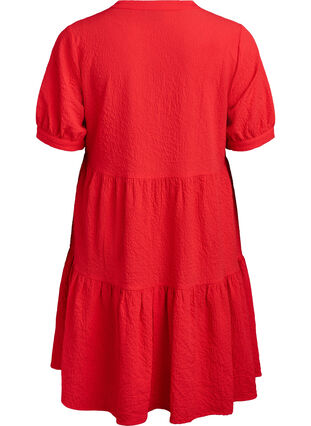 Feminin klänning i ett mjukt och luftigt material. Klänningen har korta ärmar med en subtil puffeffekt, v-ringning och sömdetaljer i nederkant som skapar ett fint fall för den lösa a-linjeformade silhuetten.