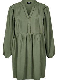 Söt kort klänning i ett lätt material med 51 % återvunnen polyester. Klänningen har veck vid bysten, knappar och diskreta broderidetaljer. Designen har rund hals med liten V-öppning, långa ärmar med elastiska muddar och en lös passform med söm i midjan.