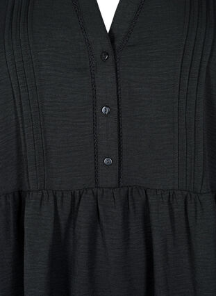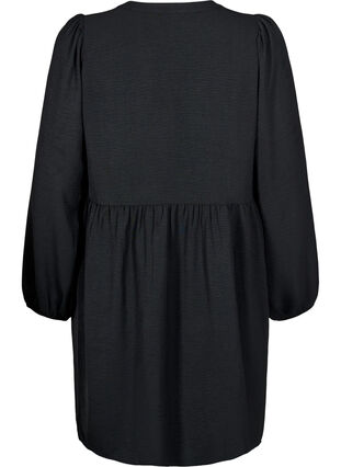Söt kort klänning i ett lätt material med 51 % återvunnen polyester. Klänningen har veck vid bysten, knappar och diskreta broderidetaljer. Designen har rund hals med liten V-öppning, långa ärmar med elastiska muddar och en lös passform med söm i midjan.