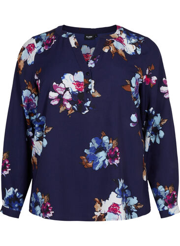 Långärmad blus med v-hals och knappar framtill. Blusen har en normal passform och ett fint tryck.