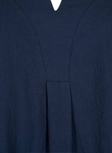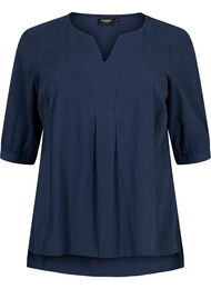 Enfärgad blus i en skön bomullskvalitet med lös A-linjeformad modell. Den har halvlånga ärmar, rund halsringning med en liten V-detalj och är något längre baktill.
