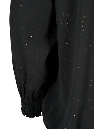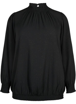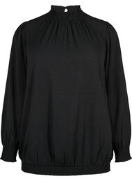 Vacker blus med invävd glittertråd och knappstängning i nacken. Blusen har smock i halsringning, ärmar och nederkant, vilket skapar en fin ballongeffekt.