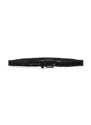 Flätat bälte i konstläder med silverfärgat spänne och vacker metallic-yta.