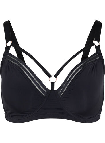 En vanlig BH med bygel och utan vaddering. BH:n har breda justerbara band och mesh samt snördetaljer över bysten.