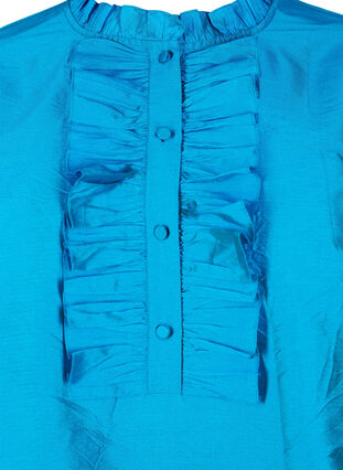 Glansig skjortblus med normal passform och feminina volangdetaljer i nacken och framtill. Skjortblusen har långa ärmar med manschetter och små veck på axlarna som skapar en lätt puffeffekt.