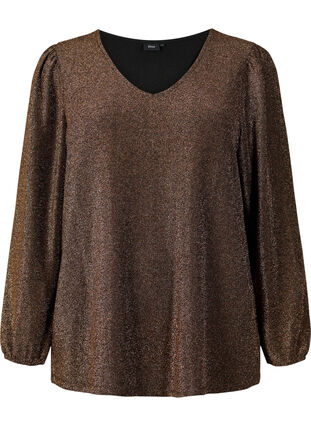 Blus helt i glitter för en festlig look. Blusen har V-ringning och långa ärmar med resår i ärmsluten och en lätt puffeffekt.