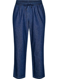 Jeans i 100 % bomull med hög midja och en avslappnad passform med raka ben. Byxorna har sidofickor och en elastisk midjeresår med justerbar dragsko.