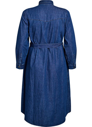 Midi-jeanklänning i vävd bomullskvalitet av 100% bomull. Klänningen har knäppning med tryckknappar fram, skjortkrage och bröstfickor med knappar. De långa ärmarna har manschetter och midjan definieras av ett avtagbart knytskärp som låter dig justera passformen efter behov och skapa en mer feminin siluett.