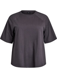 Ledig jerseyblus i en mjuk och lätt bomullsblandning med normal passform. Stilen har rund halsringning och trekvarts raglanärmar, vilket skapar en avslappnad och sportig look.