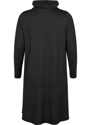 Ledig klänning med A-linjeform och fickor på sidorna. Klänningen är tillverkad i ett bekvämt och stretchigt material och har hög hals med dragsko.