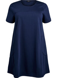 Kort jerseyklänning i mjuk och stretchig bomullskvalitet med en lös och bekväm a-linjeformad passform. Klänningen har rund halsringning, korta ärmar och dekorativa fickor fram.