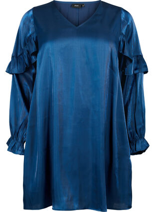 Klänning i glansig viskoskvalitet med v-ringning, långa ärmar med feminina volangdetaljer och normal passform. Den här klänningen innehåller 85 % LENZING™ ECOVERO™ Viscose fibrer som ger naturlig mjukhet och drapering.