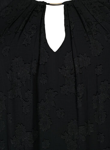 Fin kortärmad klänning med fin struktur i tyget och foder i mjuk viskos. Klänningen har nyckelhålsförslutning i nacken, rund halsringning framtill med fin v-detalj och draperingar som ger ett fint fall till den lösa a-linjeformen.