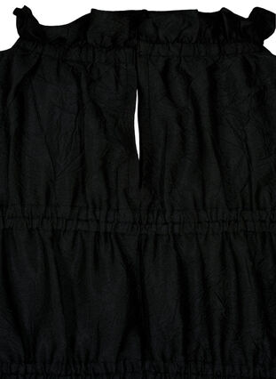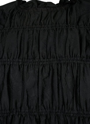 Elegant klänning med volangdetaljer på krage och ärmar. Klänningstyget har en fin struktur och horisontella skärningar med dubbla resårband, för att skapa en feminin och smickrande passform med en härlig smock-effekt.