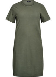 Knälång klänning i mjuk och skön bomullsjersey med ribbstickad struktur. Klänningen har rund halsringning, kort ärm med vågig kant och en figurnära silhuett.