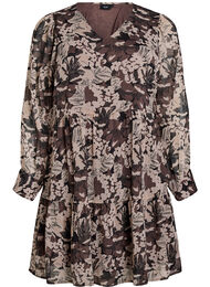 Feminin klänning i ett lätt tyg med ett vackert, flerfärgat blommönster i dämpade toner. Klänningen har en lös a-linjeformad passform med sömmar och mjuka rynkor under bysten och höfterna, vilket skapar ett mjukt fall. Stilen har långa, lätt genomskinliga ärmar med manschetter och knappar, v-ringning och en kort längd. Klänningen är fodrad i kroppen, medan ärmarna bibehåller den lätta och luftiga looken.