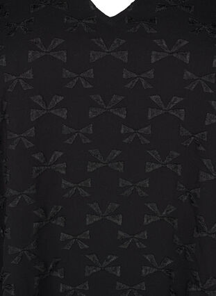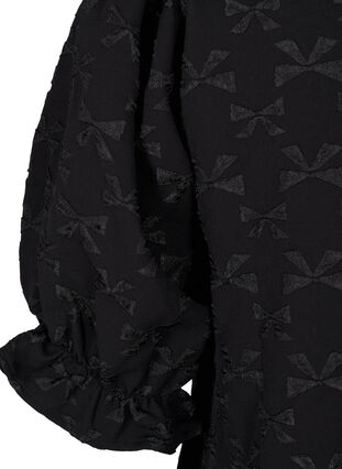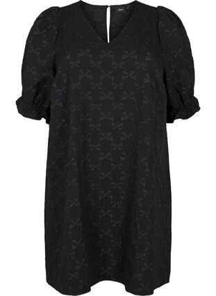Elegant kort klänning i jacquard med ett feminint rosettmönster och en bekväm A-linjeformad passform. Klänningen är designad med V-ringning, nyckelhålsstängning i nacken samt korta ärmar med resår och volangkanter som skapar en fin puffärm.